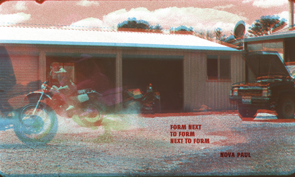 Form Next to Form Next to Form is a book made from stills from Nova Paul’s experimental 16mm film This is not Dying (2010) that was made at the film-maker’s marae Maungarongo in the north of New Zealand’s North Island. Using an early cinematic optical printing process of three-colour separation Paul's films render the landscape in prismatic shards of technicolour. In this book stills are printed using RGB colours designed to echo the optical process of the three-colour separation film itself.
